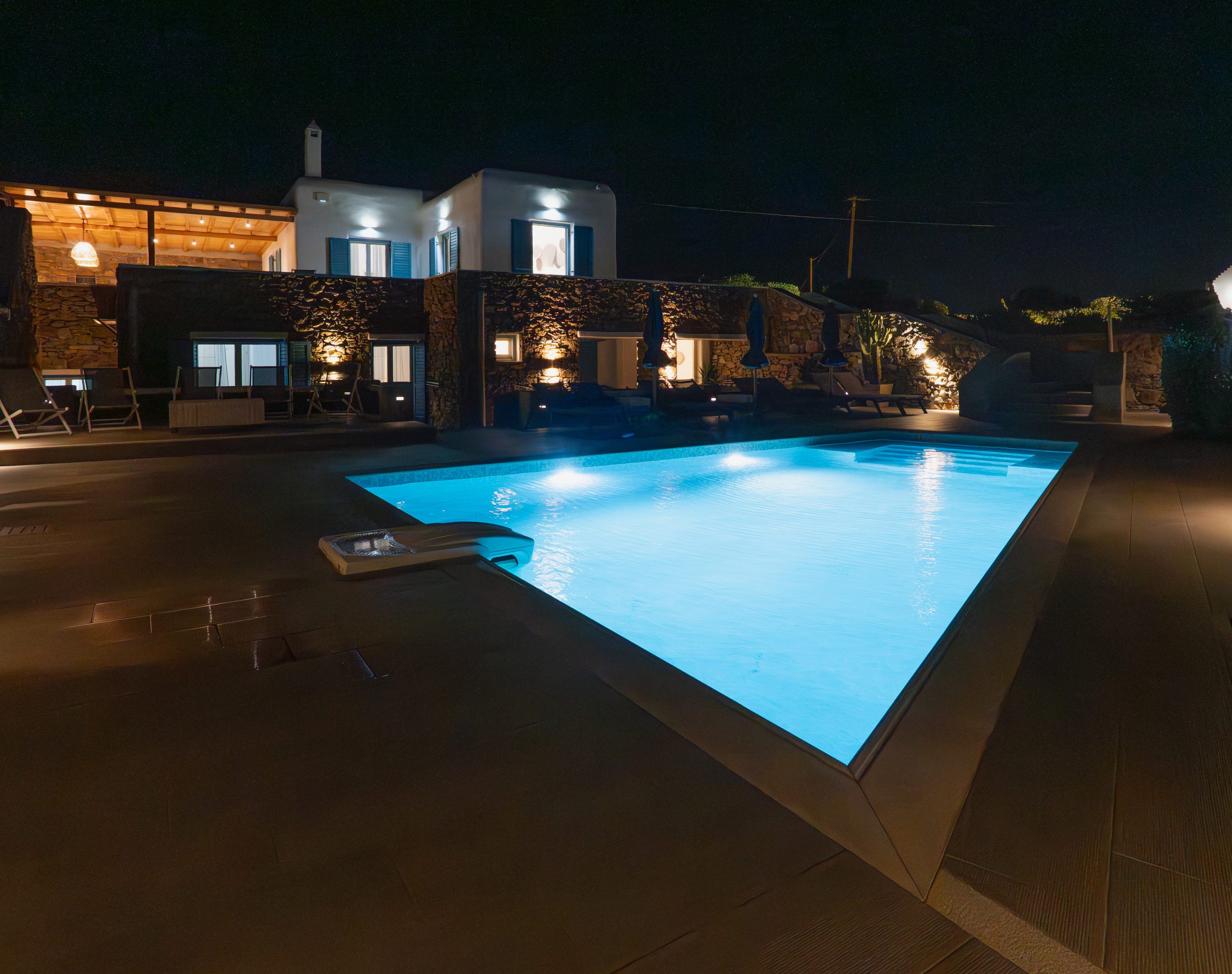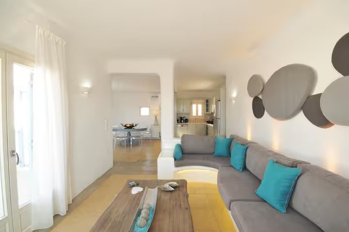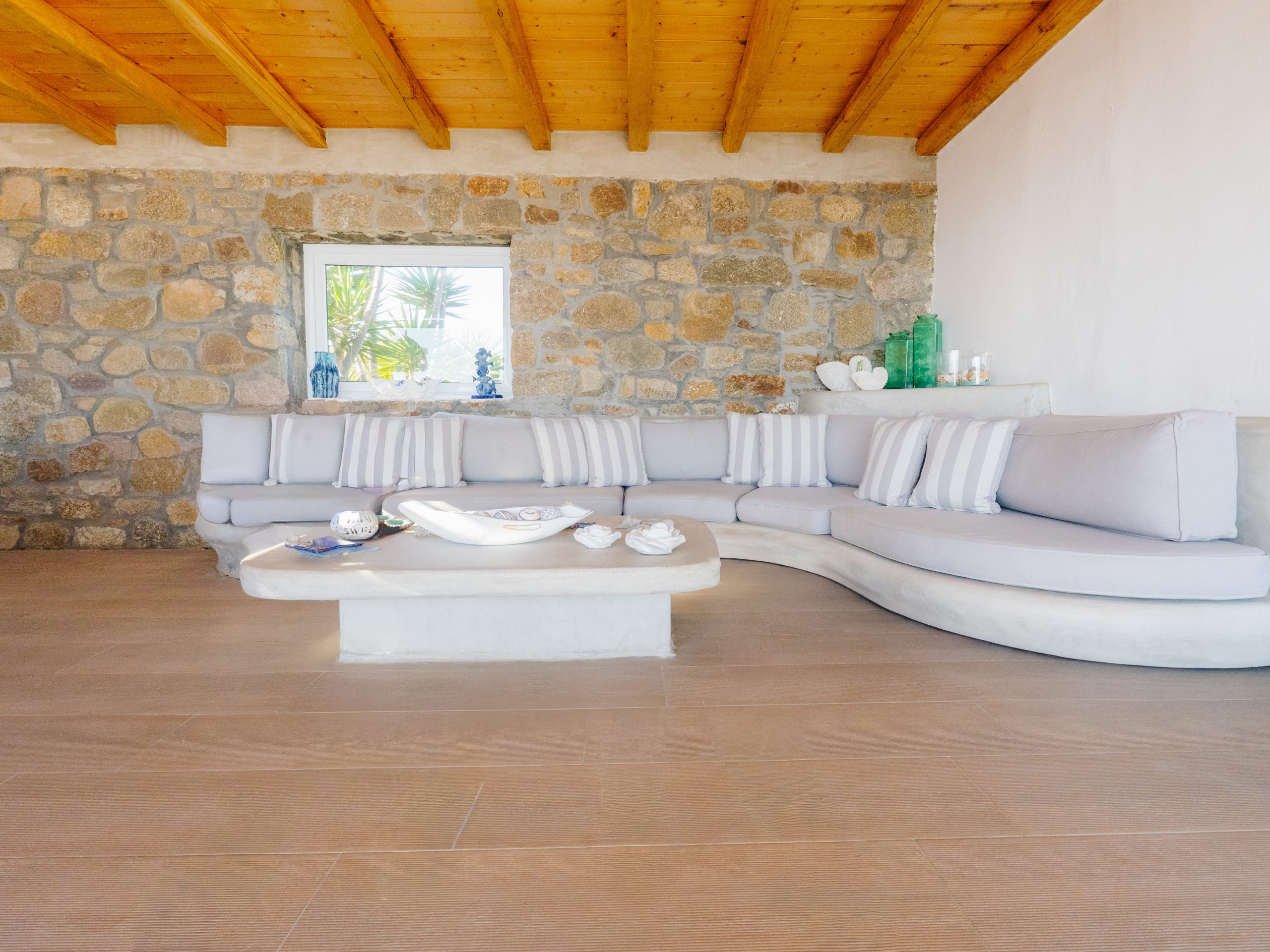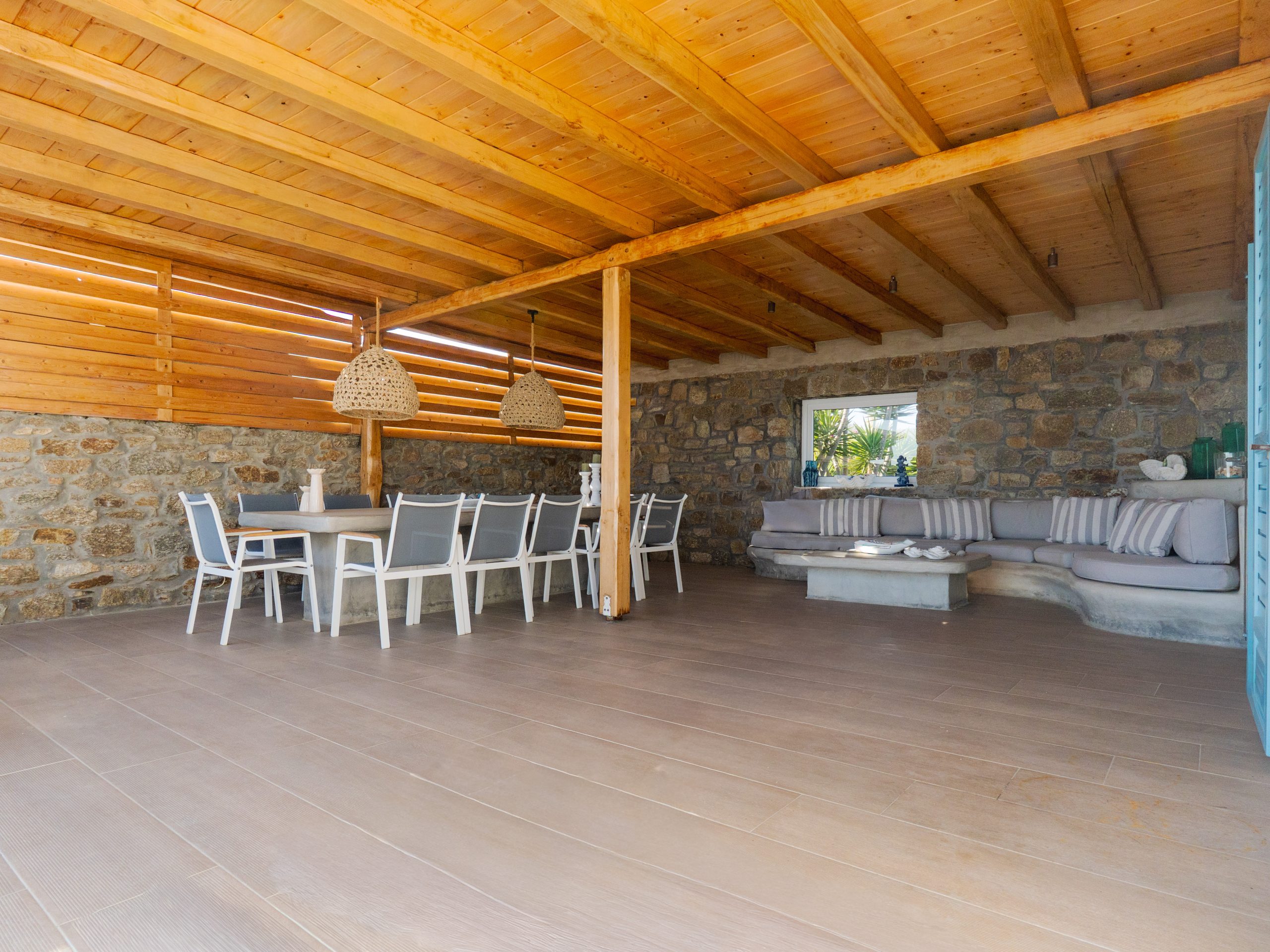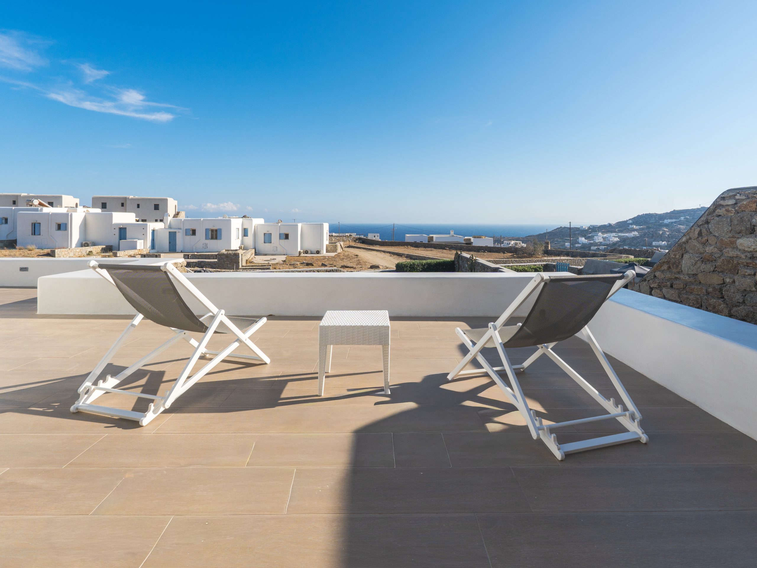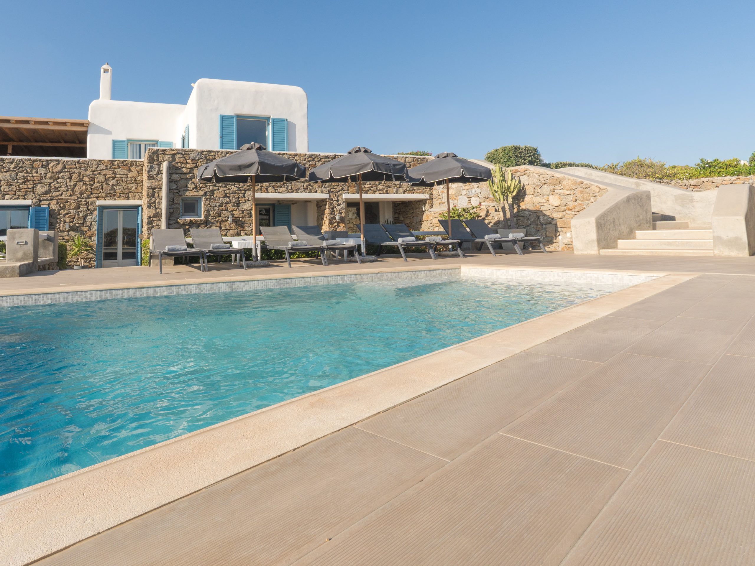 The villa location is convenient to explore the popular southern beaches of the island, the most popular of which, Super Paradise Beach, is just 2min away by car(1200m). Mykonos Town is only 10 min. away while the airport is just 7 min. away. From the big terrace , there is also a wonderful view of the islands of Paros and Naxos, while on a clear day, one may also see in the distant horizon the island of Ios.