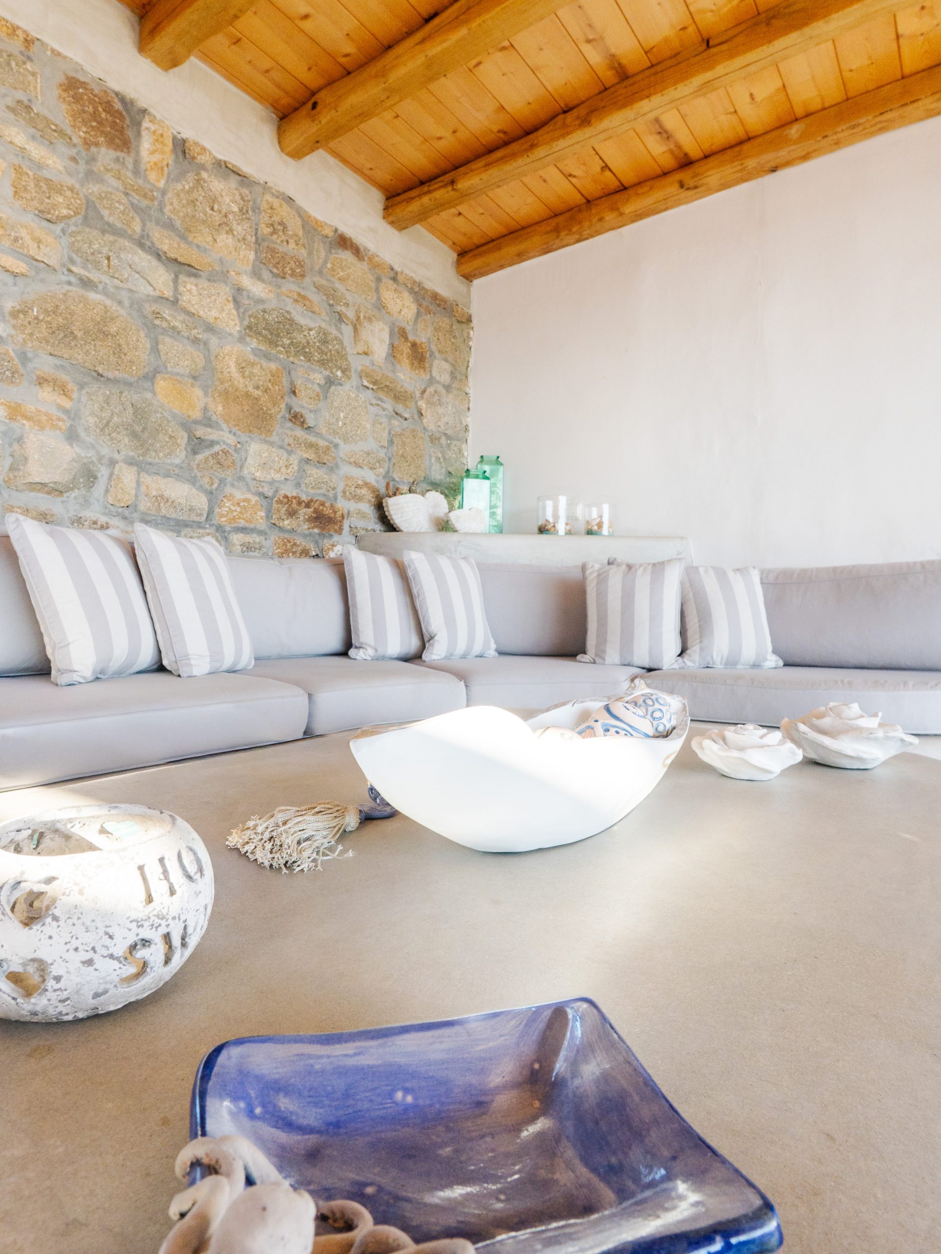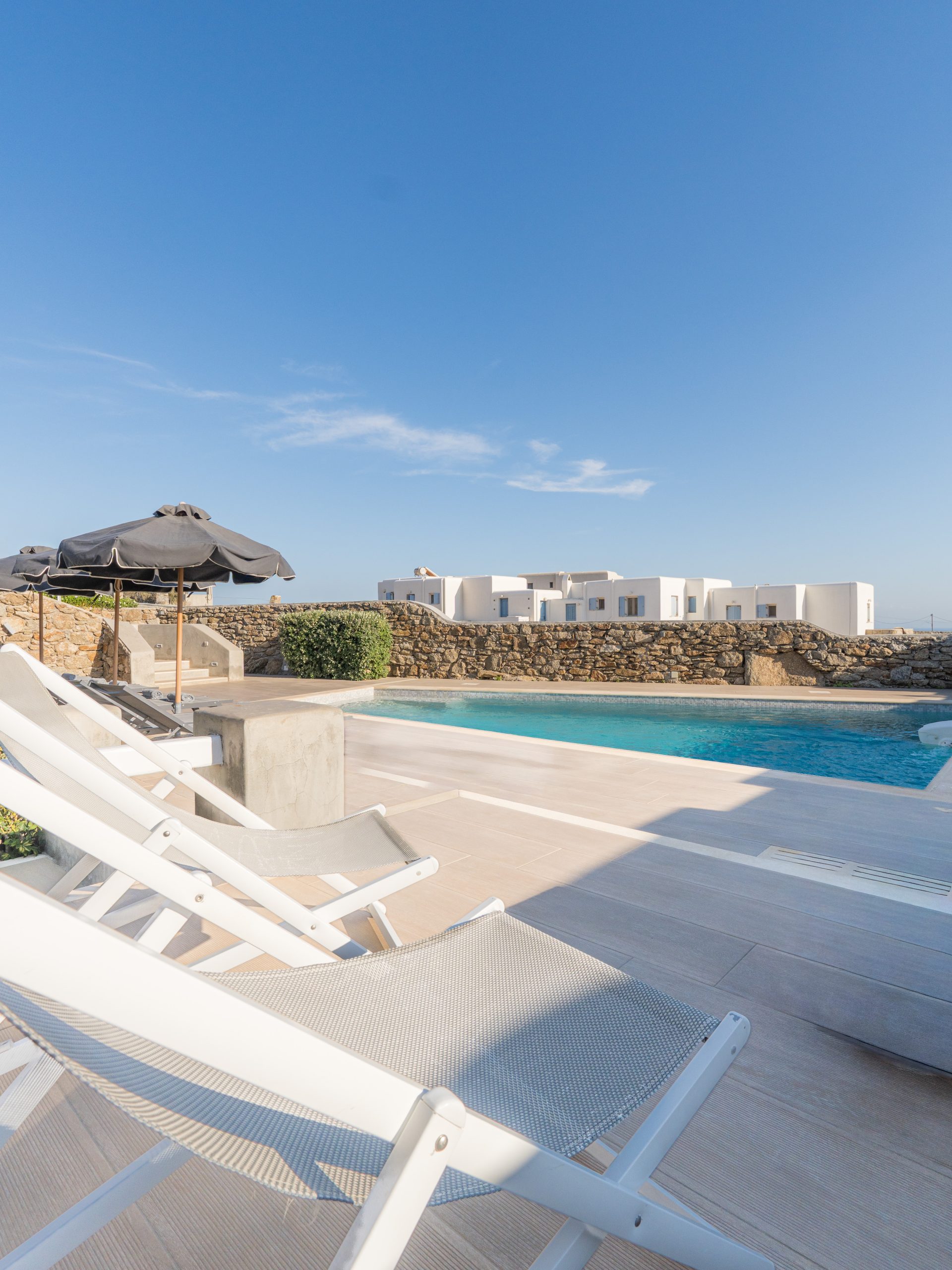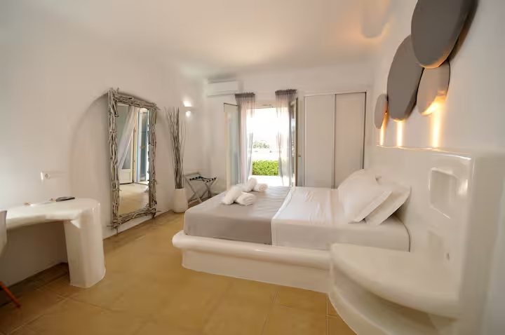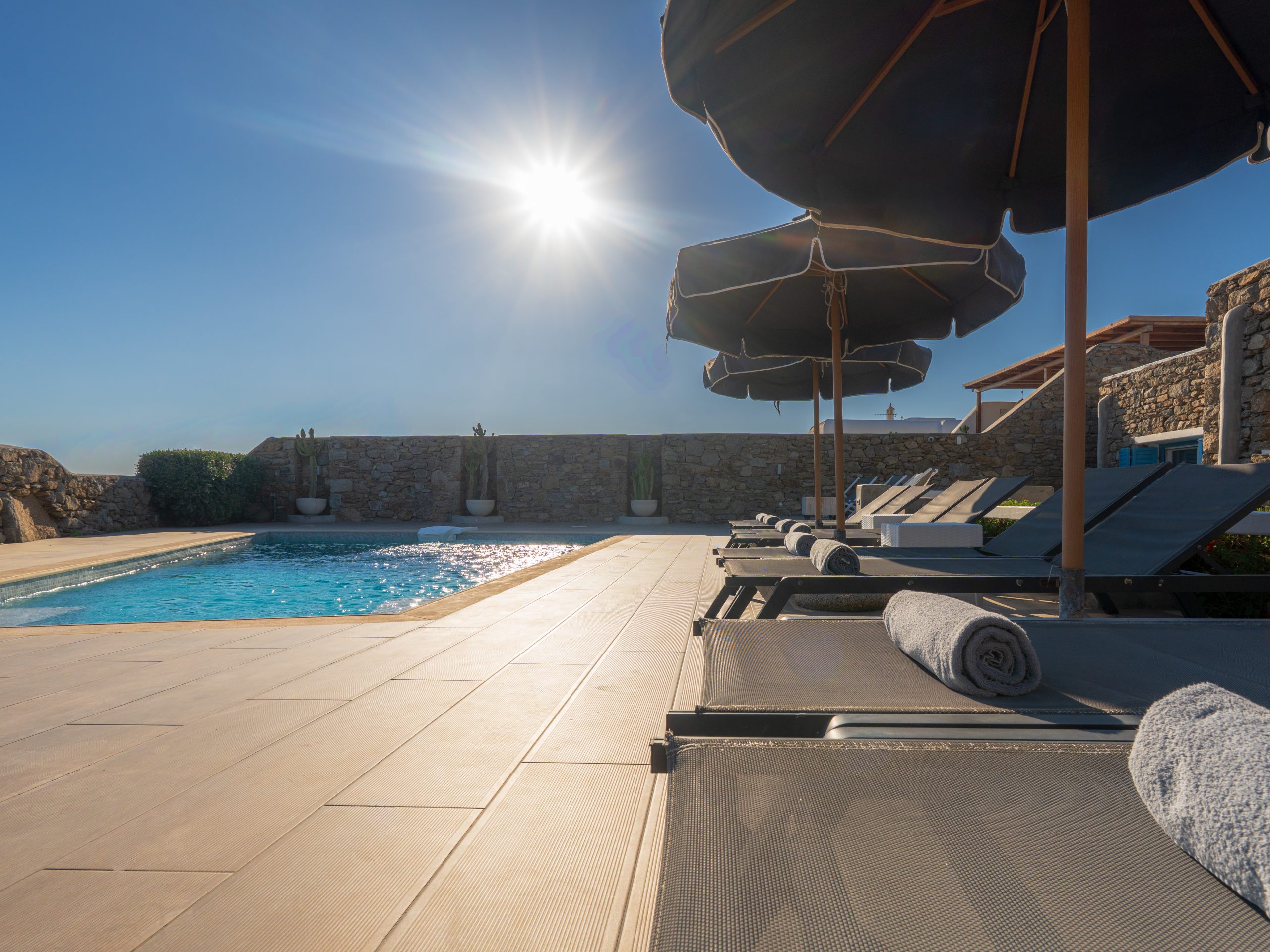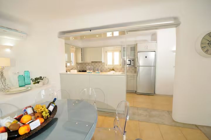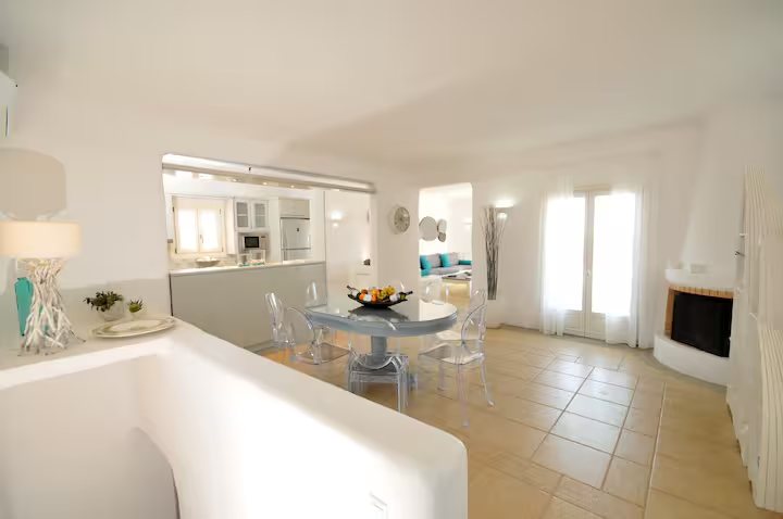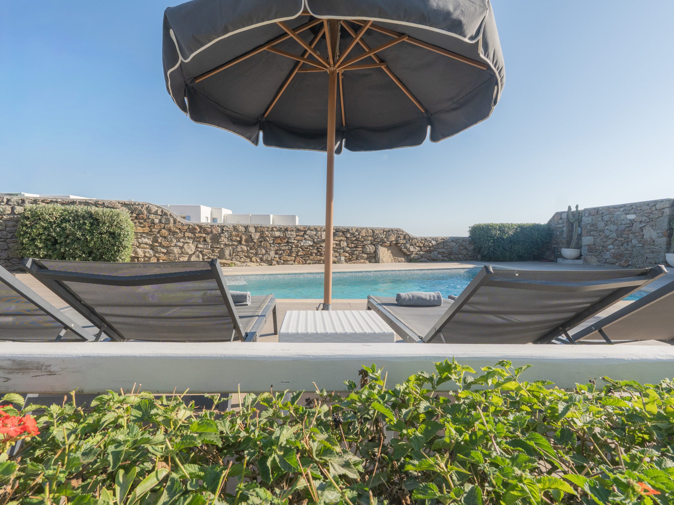 The villa location is convenient to explore the popular southern beaches of the island, the most popular of which, Super Paradise Beach, is just 2min away by car(1200m). Mykonos Town is only 10 min. away while the airport is just 7 min. away. From the big terrace , there is also a wonderful view of the islands of Paros and Naxos, while on a clear day, one may also see in the distant horizon the island of Ios.
