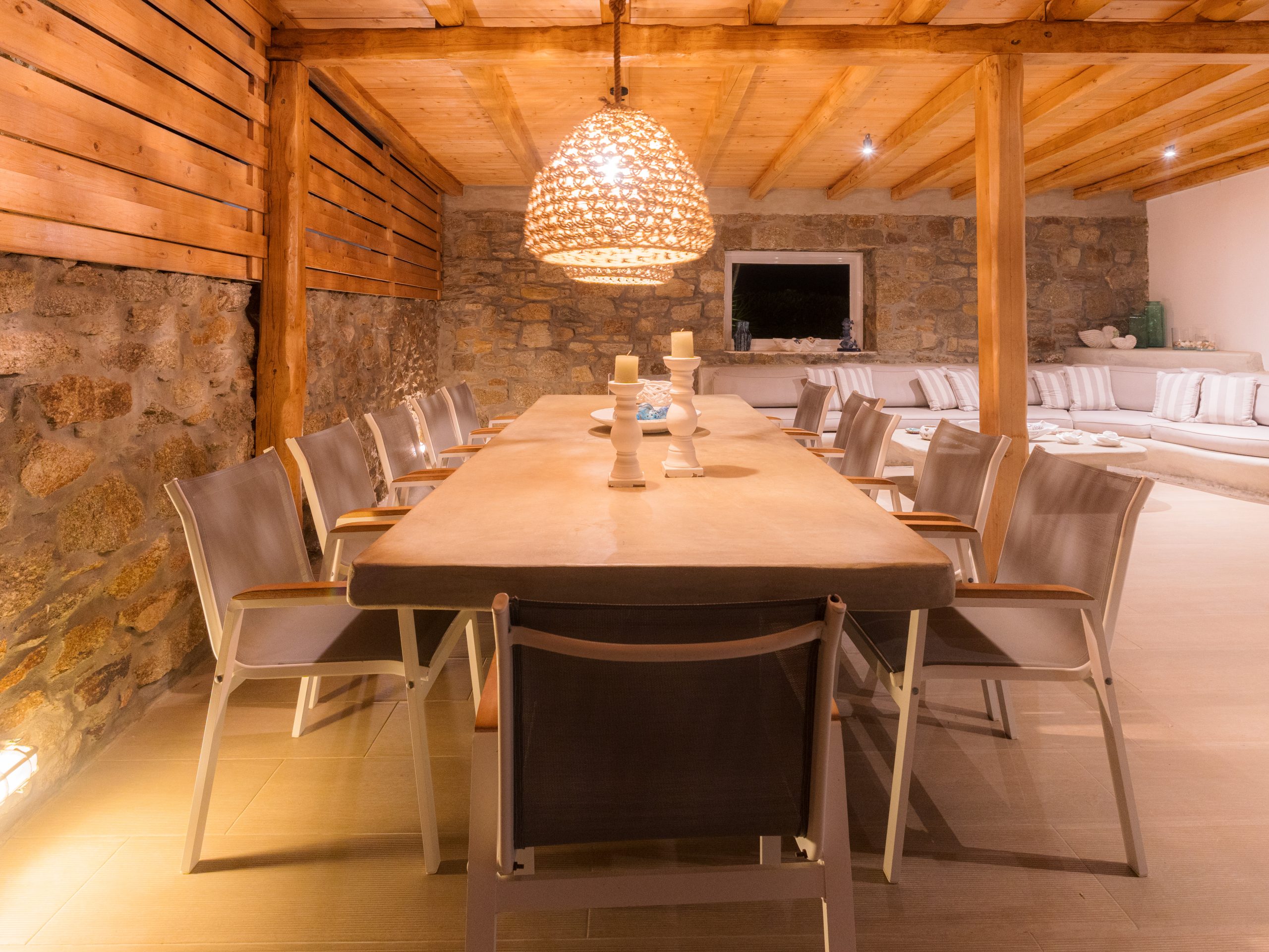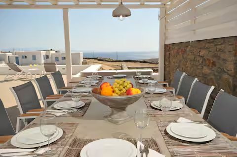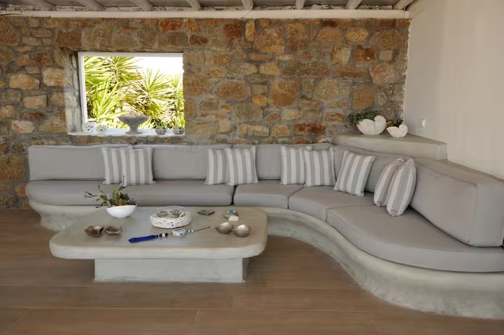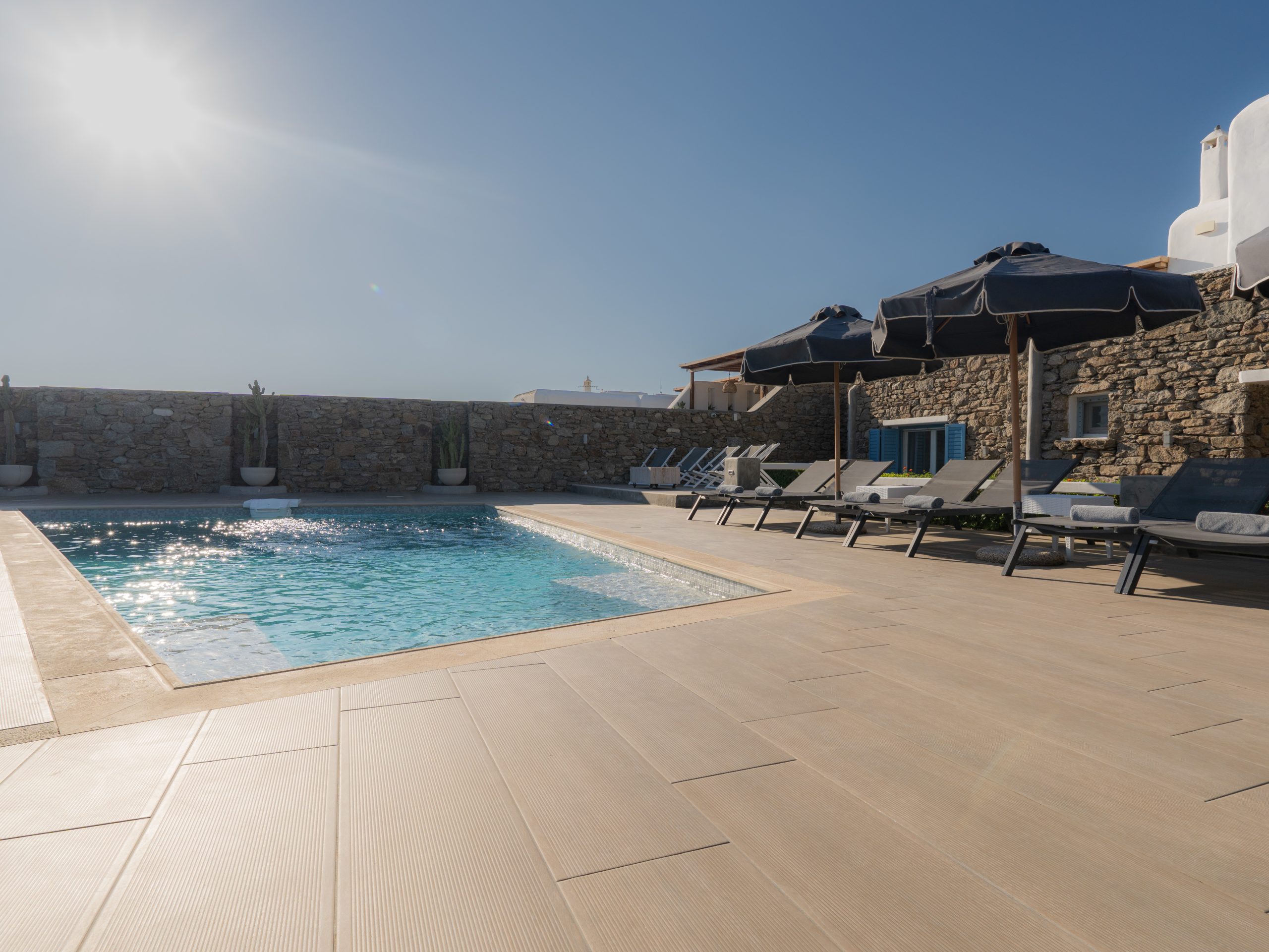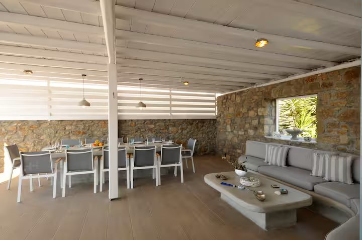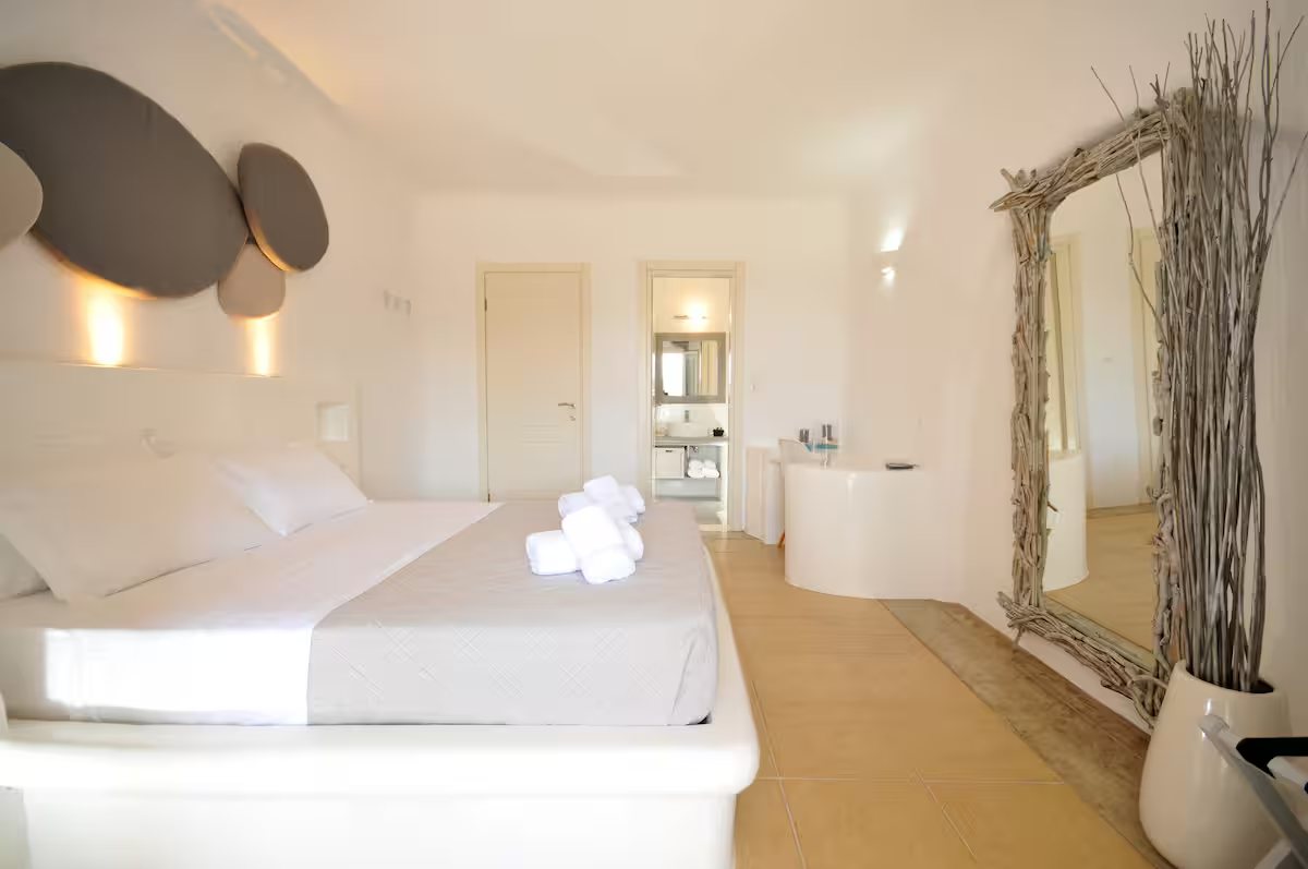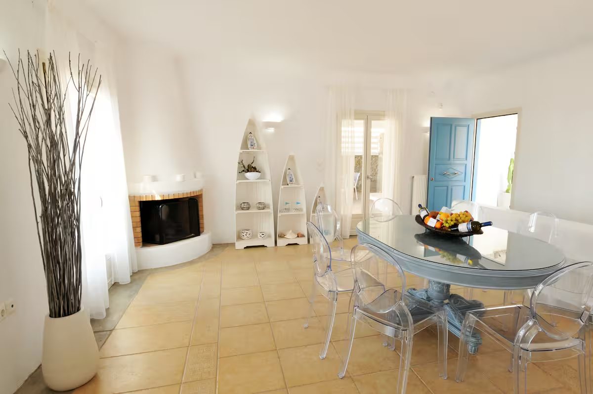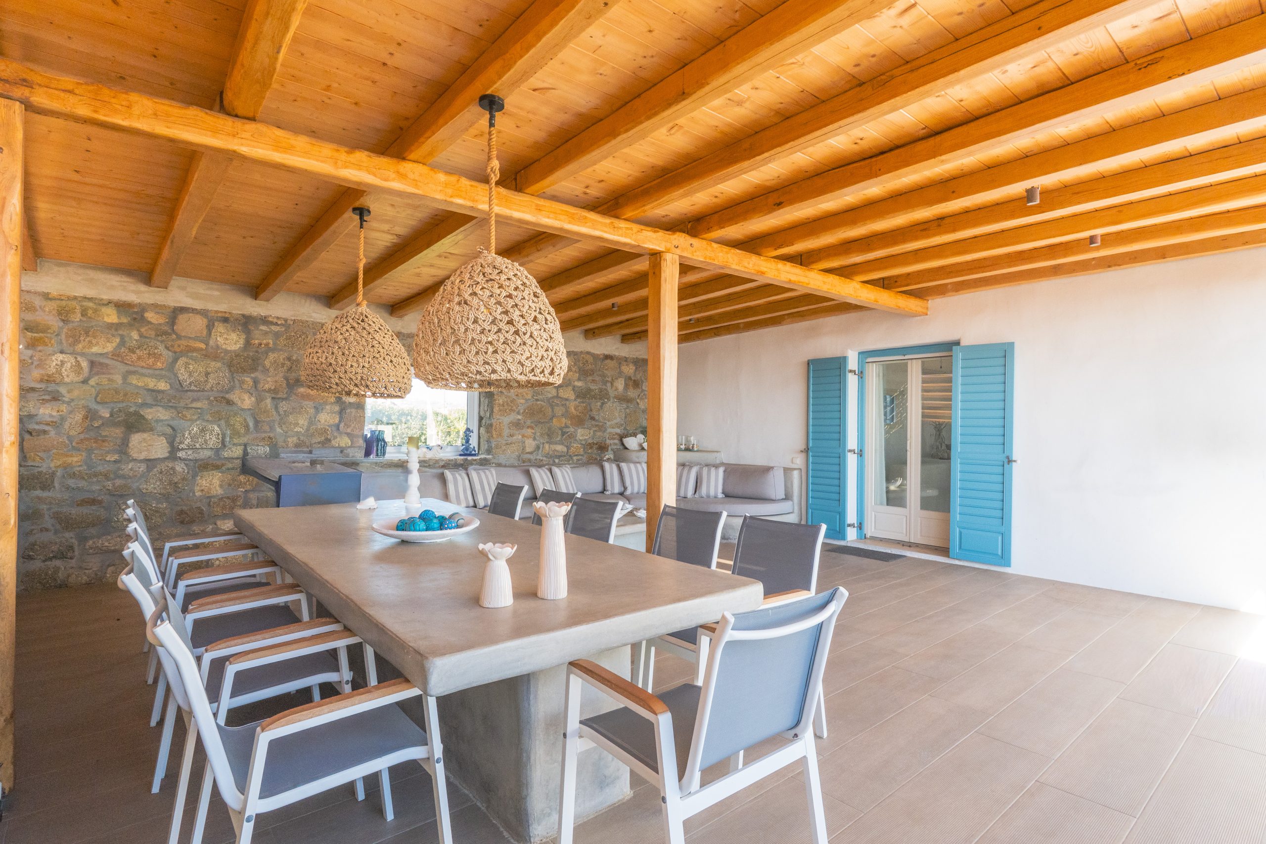 The villa location is convenient to explore the popular southern beaches of the island, the most popular of which, Super Paradise Beach, is just 2min away by car(1200m). Mykonos Town is only 10 min. away while the airport is just 7 min. away. From the big terrace , there is also a wonderful view of the islands of Paros and Naxos, while on a clear day, one may also see in the distant horizon the island of Ios.