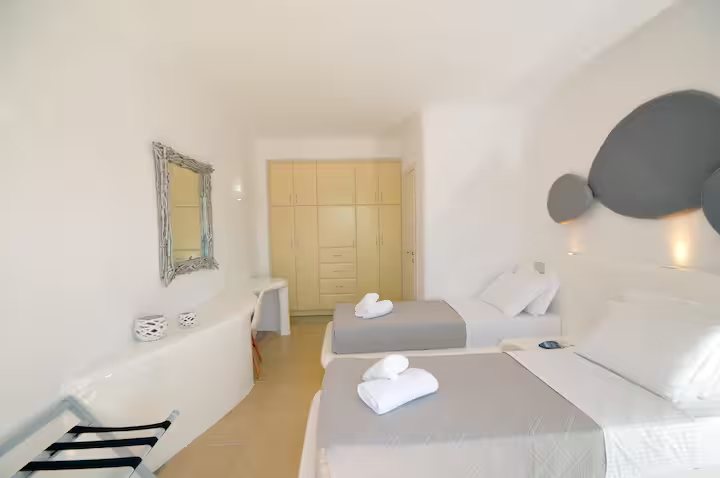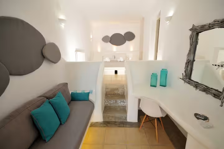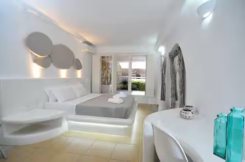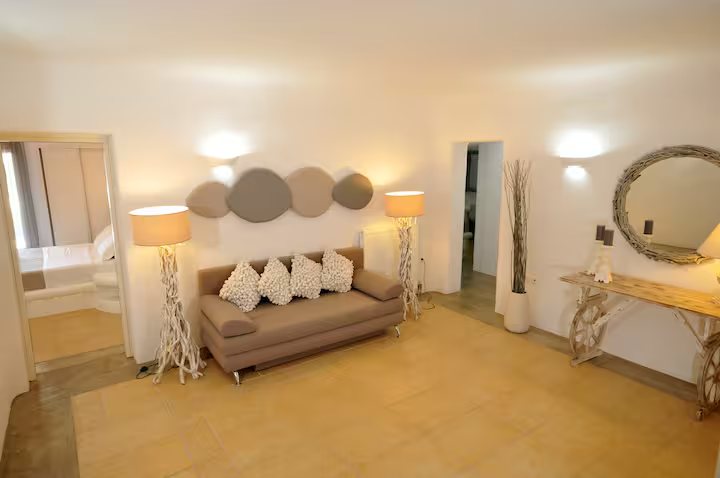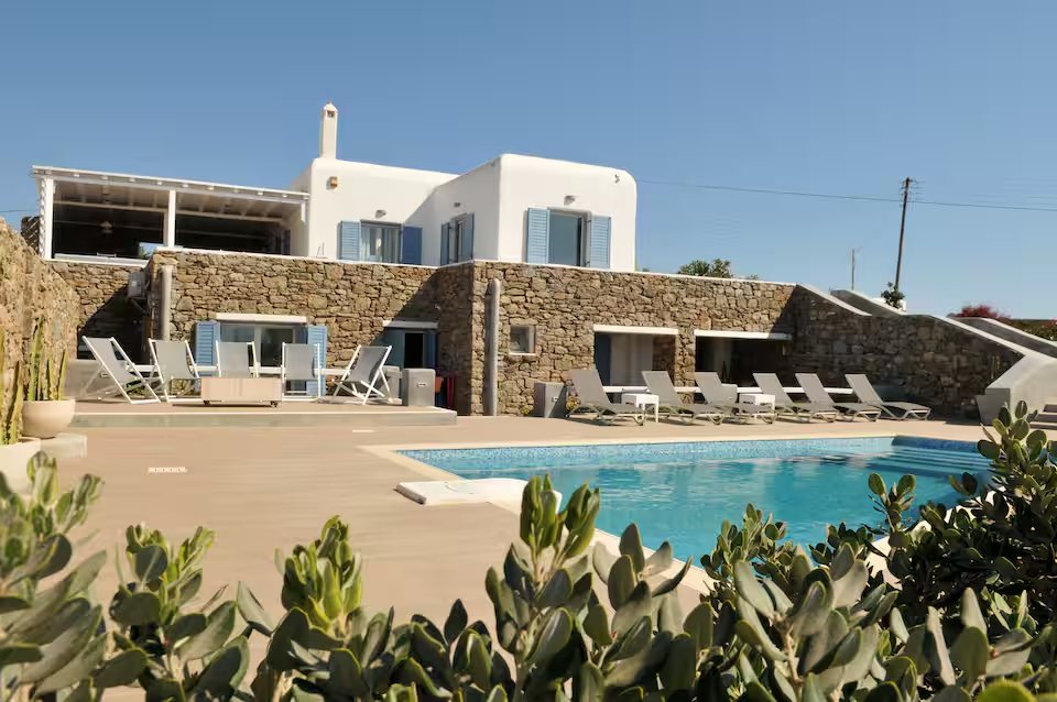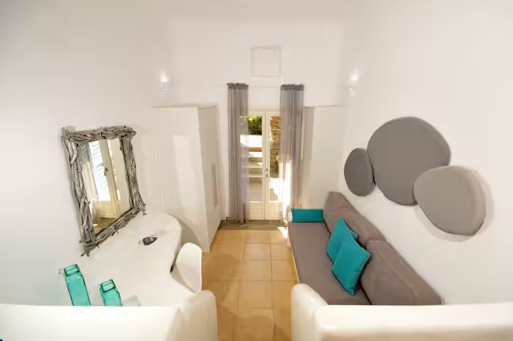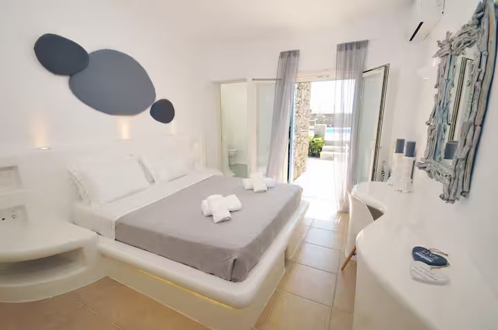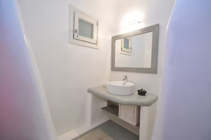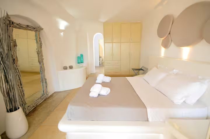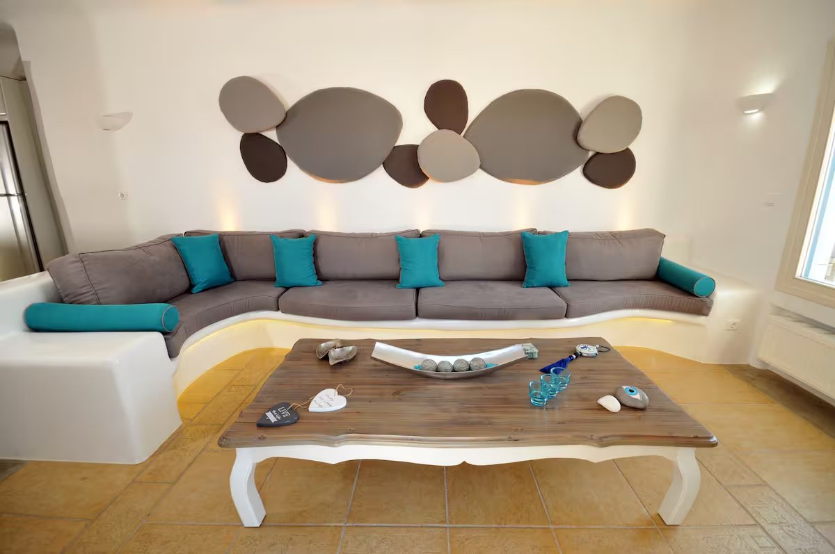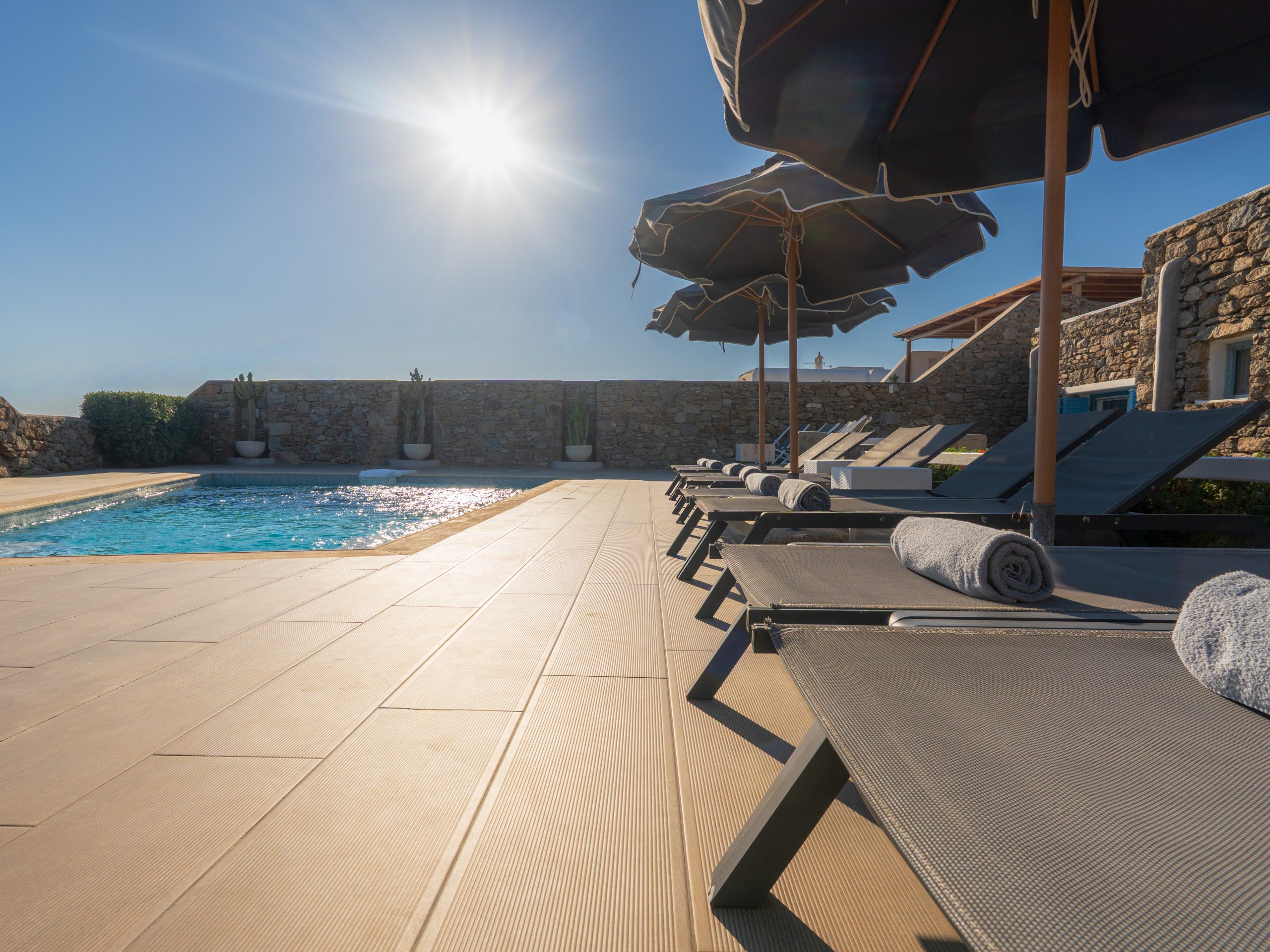 The villa location is convenient to explore the popular southern beaches of the island, the most popular of which, Super Paradise Beach, is just 2min away by car(1200m). Mykonos Town is only 10 min. away while the airport is just 7 min. away. From the big terrace , there is also a wonderful view of the islands of Paros and Naxos, while on a clear day, one may also see in the distant horizon the island of Ios.