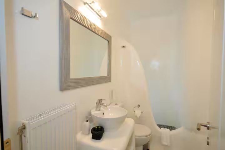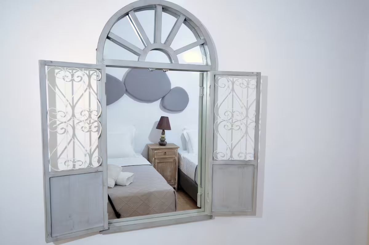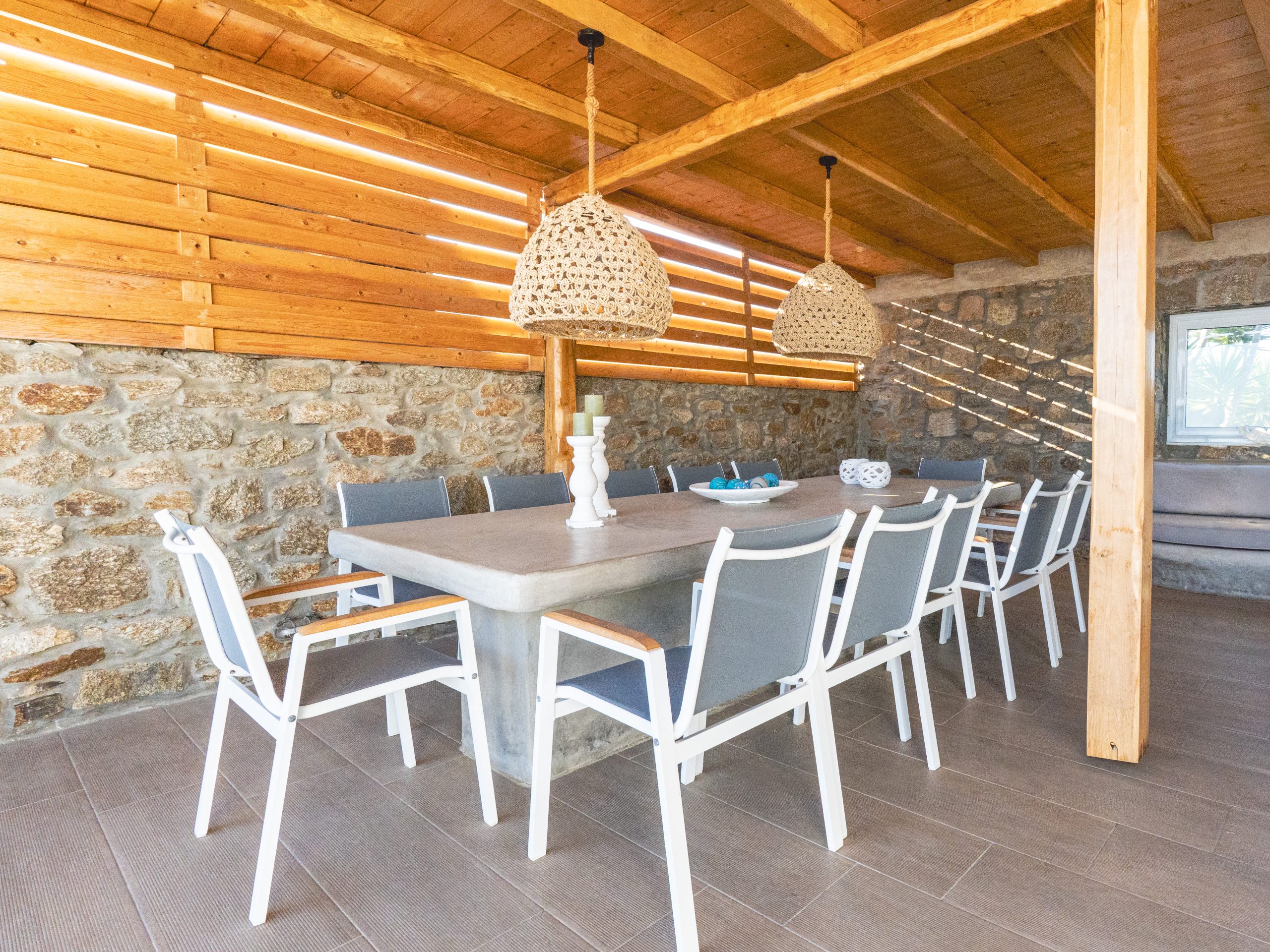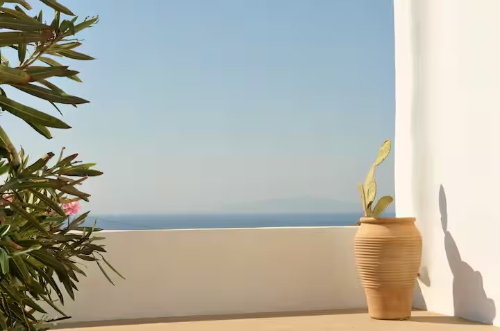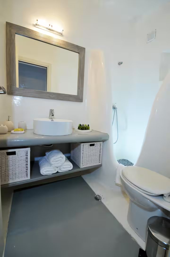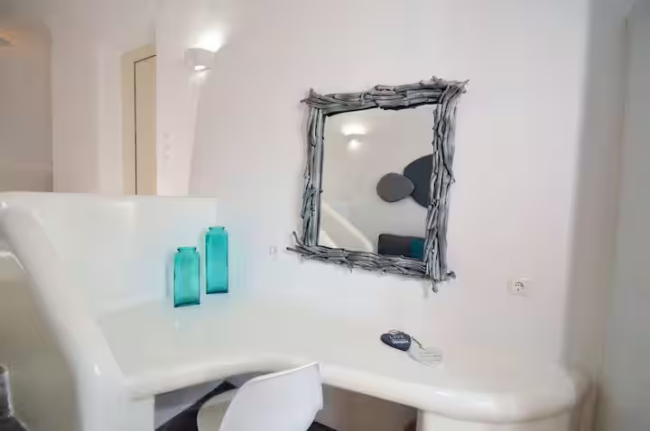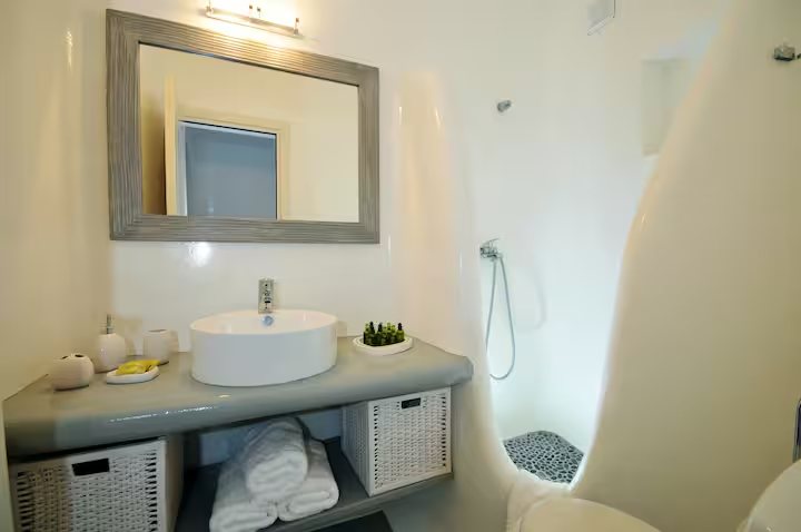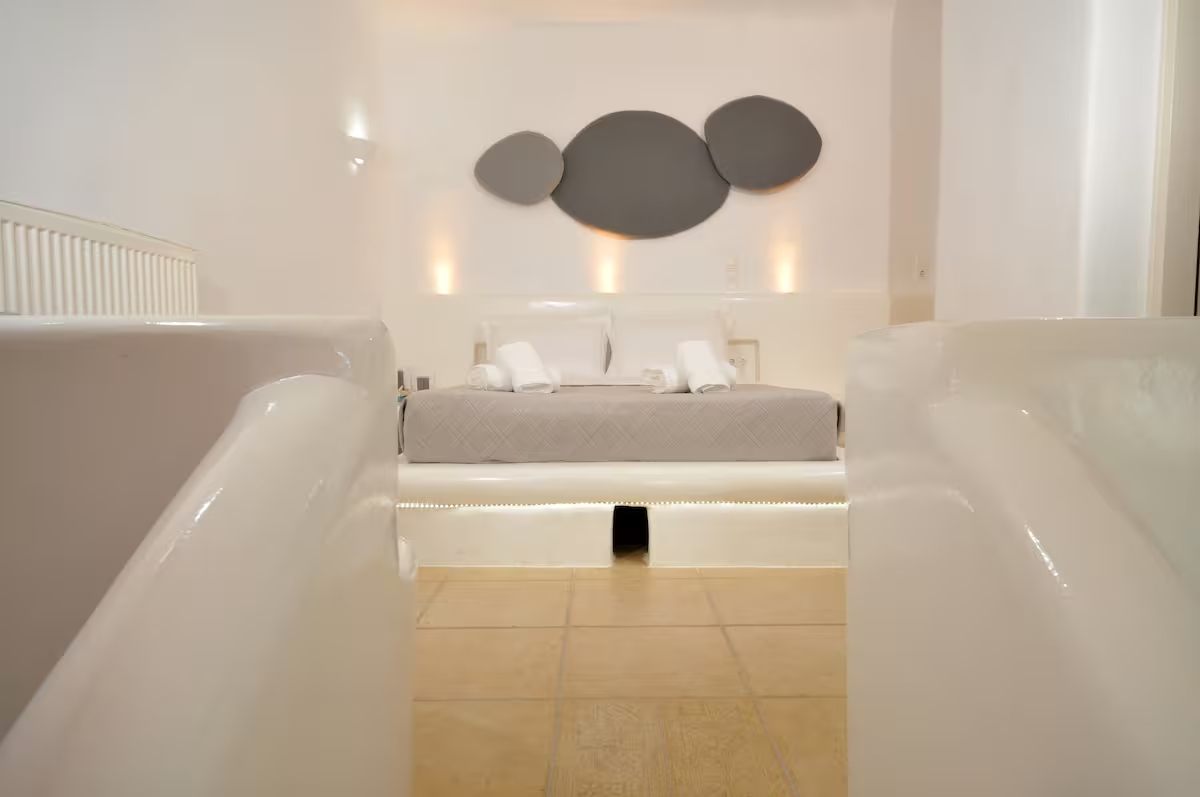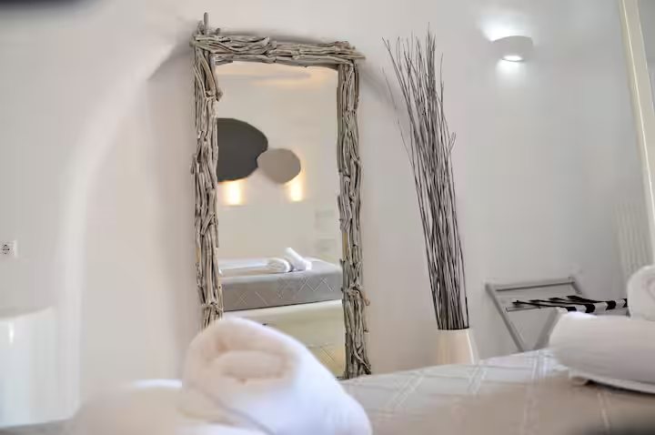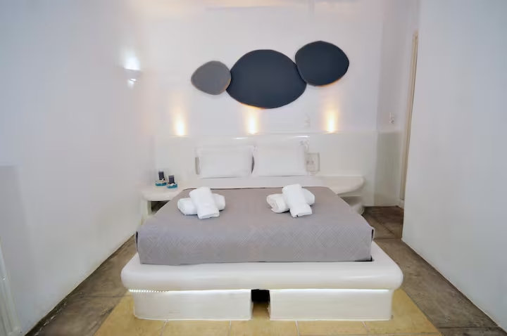 The villa location is convenient to explore the popular southern beaches of the island, the most popular of which, Super Paradise Beach, is just 2min away by car(1200m). Mykonos Town is only 10 min. away while the airport is just 7 min. away. From the big terrace , there is also a wonderful view of the islands of Paros and Naxos, while on a clear day, one may also see in the distant horizon the island of Ios.